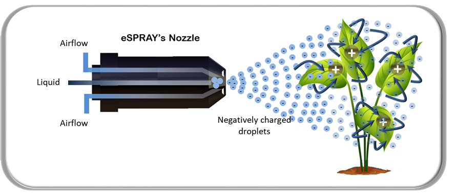 The electrically–charged droplets are automatically attracted to the “grounded plant”. This charge on the droplets is small, but the force attracting the spray droplets to the “target plant” is up to 75 times greater than the force of gravity. Electrical charging causes a natural force of attraction between the spray droplets and the plant, which allow droplets to move in a reverse direction and move upwards, against gravity to coat the underside and back sides of the plant’s leaf, fruits and vegetables. This phenomenon referred to as “electrostatic wrap-around”.